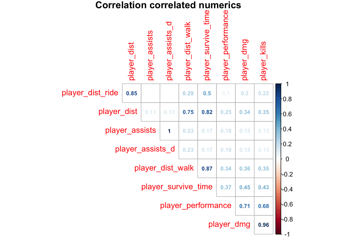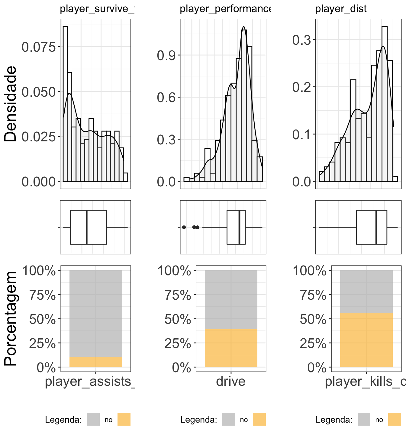 Como era de se esperar, o risco de ser abatido diminui para jogadores que possuem melhor performance e também para os jogadores que percorrem maiores distâncias (o que mostra que ficar parado no jogo em uma zona pode não ser a melhor ideia, já é quanto mais se movimenta maior a quantidade de itens que podem ser coletados).
