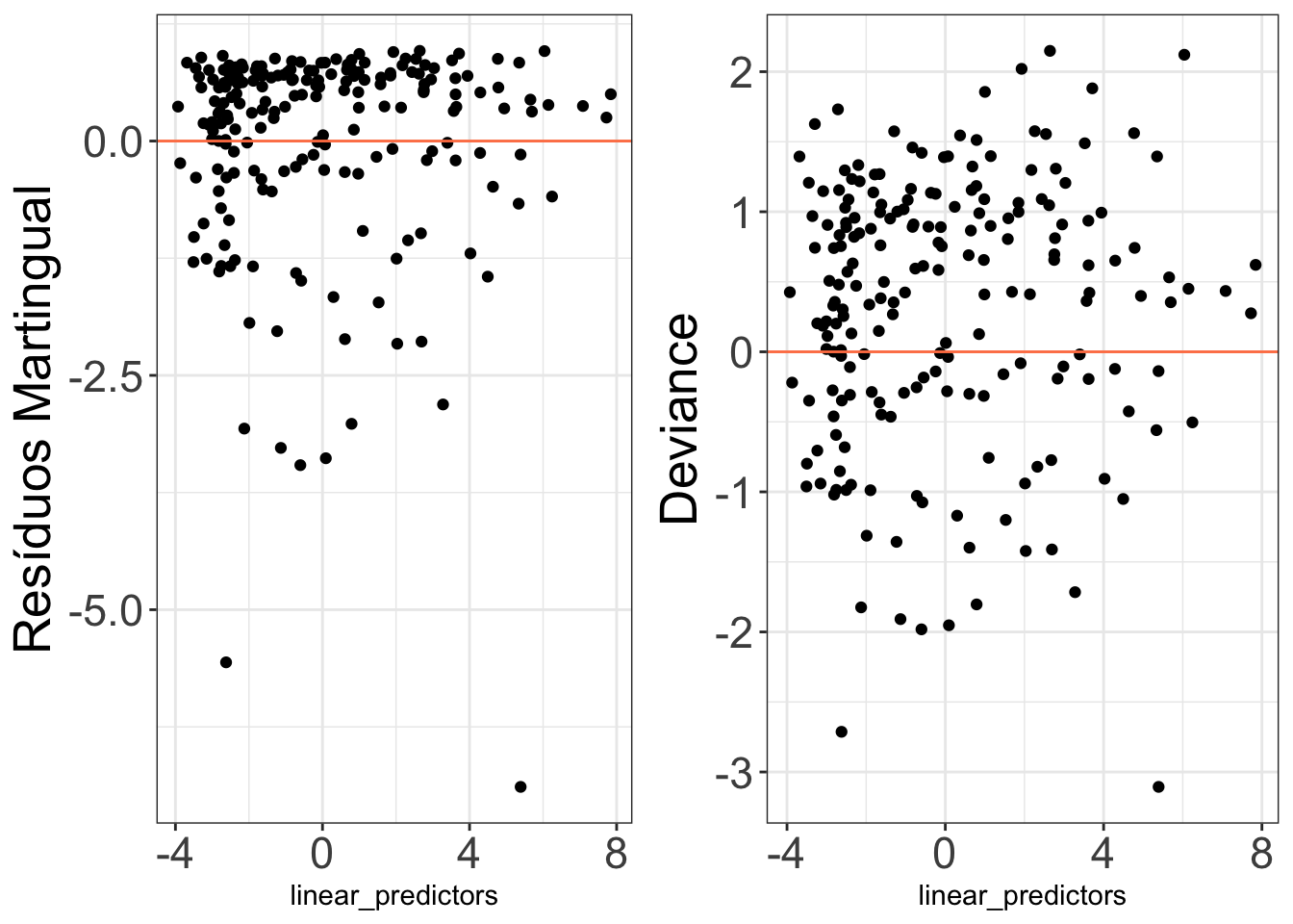 Esses resíduos são vistos como uma estimativa do numero de falhas em excesso observada nos dados mas não predito pelo modelo. Os mesmos são usados, em geral, para examinar a melhor forma funcional (linear, quadrática, etc.) para uma dada covariavel em um modelo de regressão assumido para os dados do estudo.