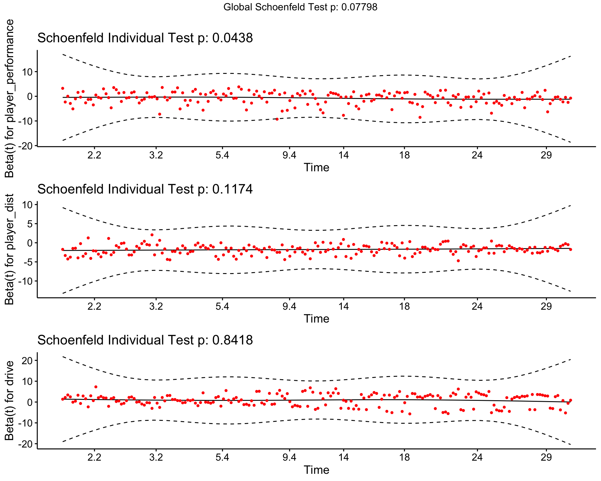 Em princípio, os resíduos de Schoenfeld são independentes do tempo. Um gráfico que mostra um padrão não aleatório contra o tempo é evidência de violação da suposição de hipótese.