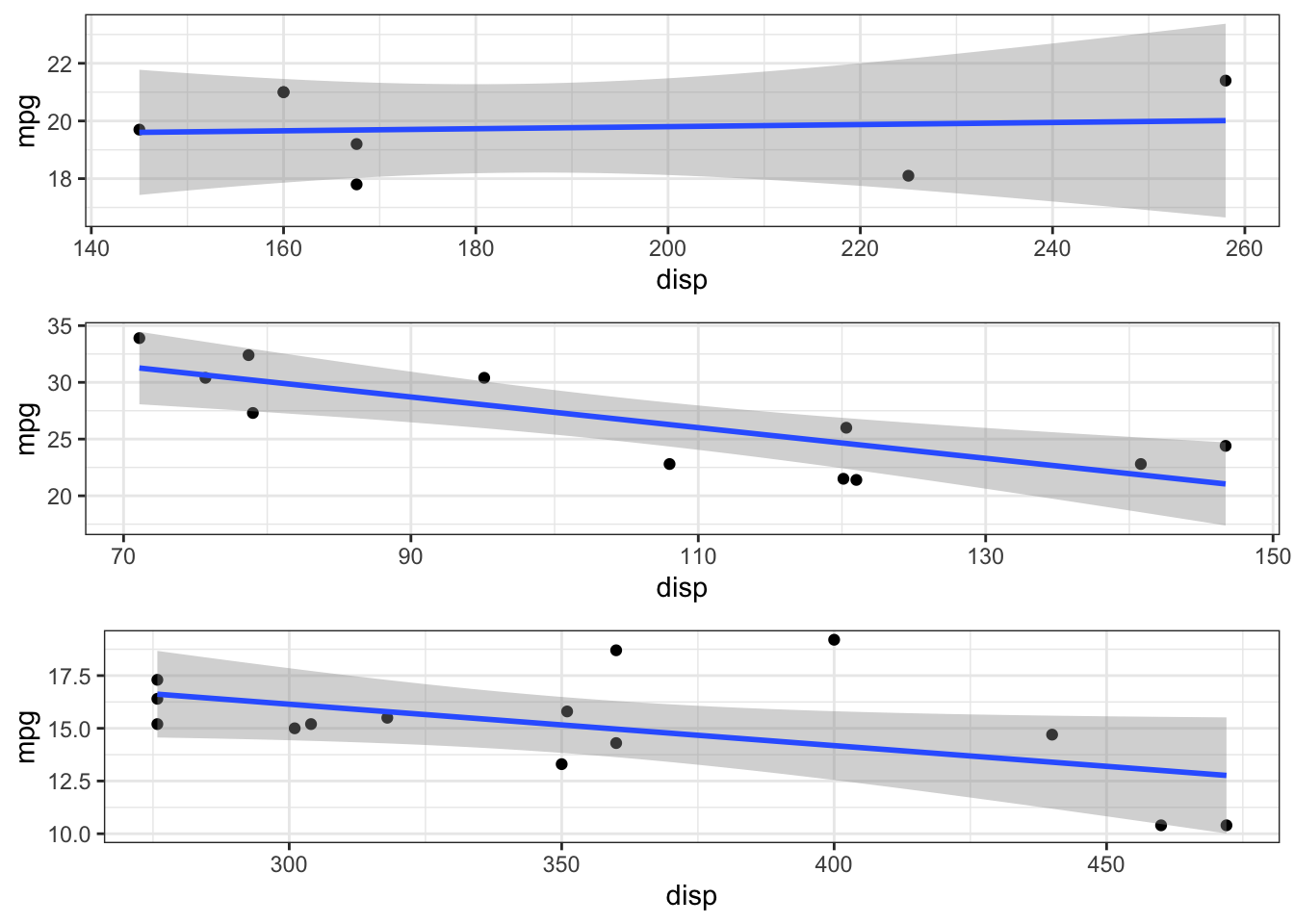 mutate(plots = map(data, ~ggplot(.x, aes(x=disp, y=mpg))+geom_point()+geom_smooth(method = "lm"))) %$%