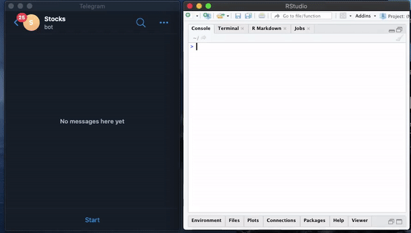 Com a configuração no aplicativo do Telegram concluída, o primeiro passo para configurar as ações do bot no R é iniciar um objeto TGBot declarando o id do seu bot. No meu caso o bot se chama Stocks e o id é fgstockbot.