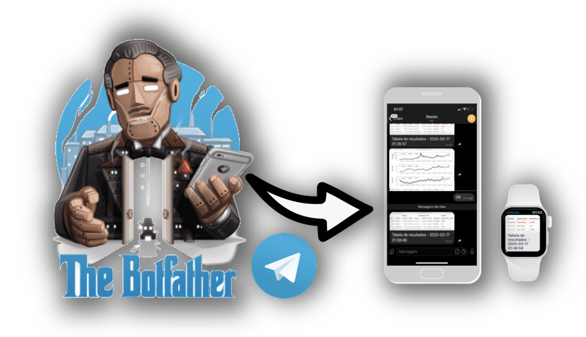 Ao final do post criaremos um robô no telegram que coletará os dados das cotações adquiridas, aplicará o modelo Prophet do Facebook para forecast e analisará a desmontagem da carteira segundo os critérios estabelecidos e enviará mensagens para nós com uma tabela financeira automatizada via Telegram como mostra na animação: