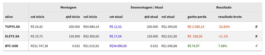 - Valores de cotação e quantidade adquiridas de cada uma no momento da montagem da carteira;
