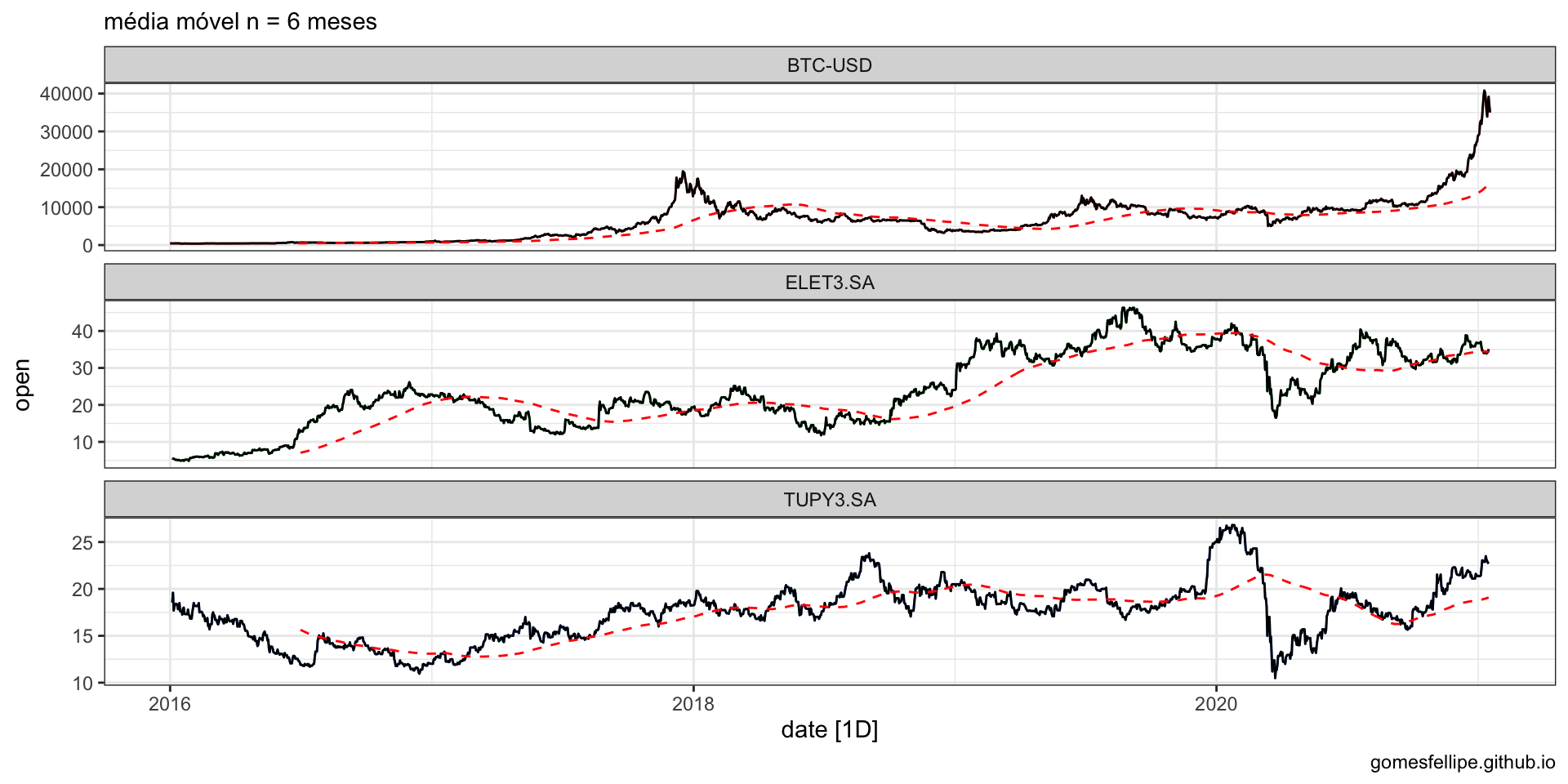 A aquisição das série históricas das cotações destes ativos desde 01/01/2016 foram obtidas utilizando o pacote tidyquant que nos retorna os dados das cotações das ações informadas em formato “arrumado” (ou seja, familiar com funções do tidyverse), veja: